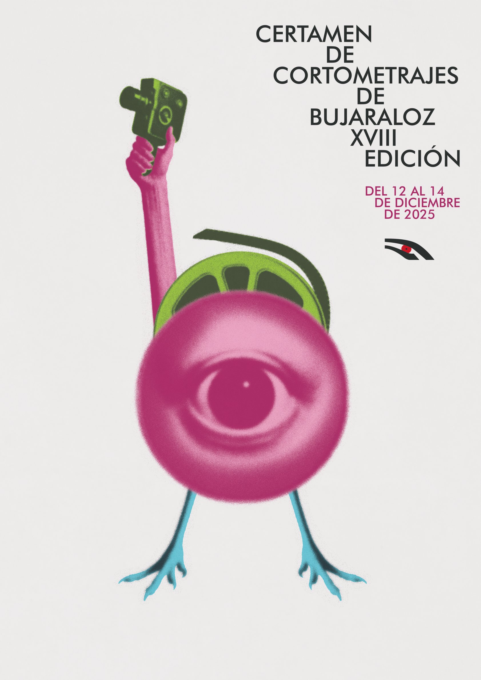 El personaje sostiene una cámara de 8 mm, un gesto que funciona como homenaje al cine en su forma más pura y primitiva, recordándonos el origen y la esencia del arte que celebramos en este festival.